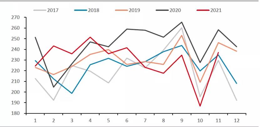 11月份,全國生鐵產量為6173萬噸,環(huán)比下降2.1%,同比下降16.6%。據(jù)此測算,11月份生鐵日均產量205.8萬噸,環(huán)比增加1.2%。